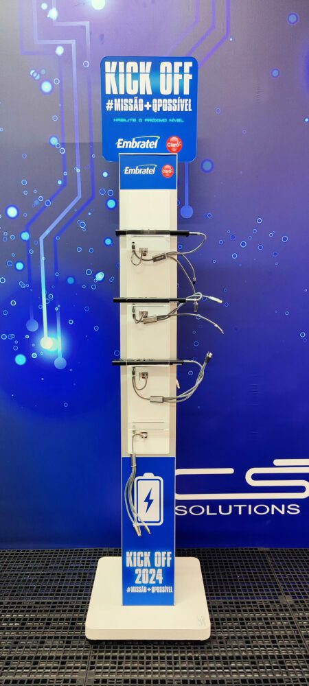 TENDÊNCIA: Totem Cable Carregador para Controle Remoto (frente e verso) para recarregar controle remoto, contendo 16 entradas USB e 8 cabos especiais com conexões Lightning, V8 e Type-C (USB C) para Lojas.